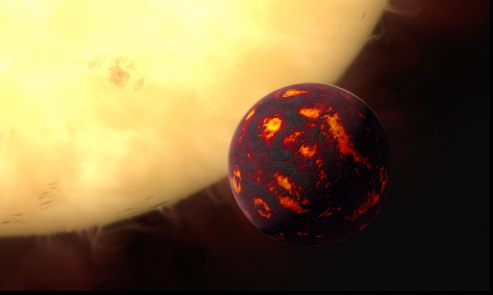 An artist’s impression of the planet Janssen, which orbits its star so closely that its entire surface is a lava ocean that reaches temperatures of around 2,000 degrees Celsius. Credit: ESA/Hubble, M. Kornmesser