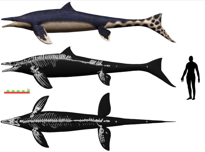 Extra-long rear flippers might have aided propulsion in concert with its long finned tail. And unlike other mosasaurs, or large extinct marine reptiles, it had a dorsal fin like a shark’s that would have helped it turn quickly and with precision in the water.