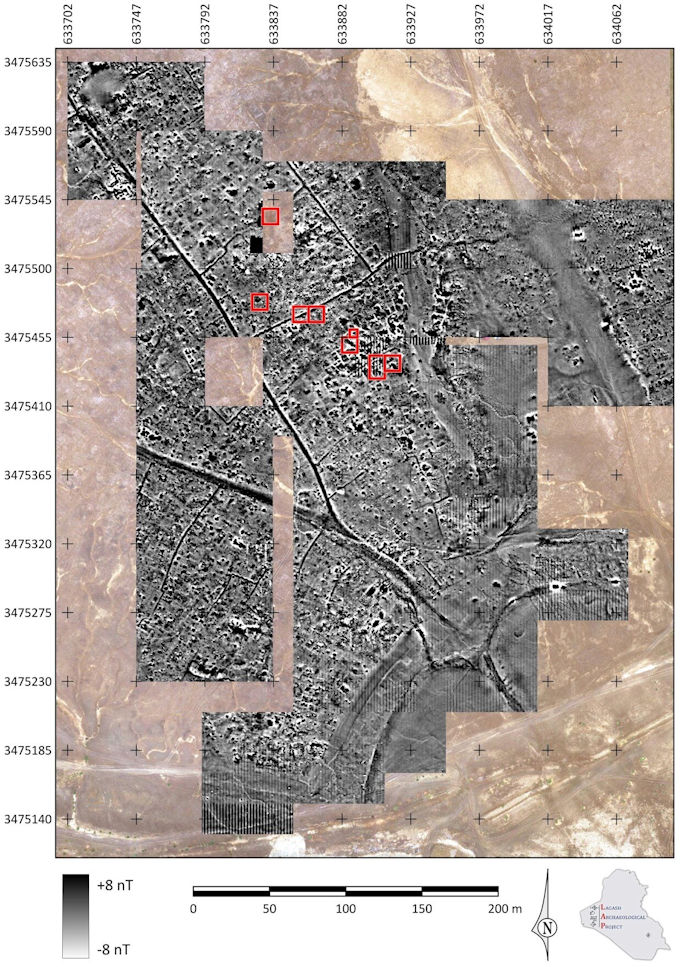 A portion of the site known as Area H, which sits in Lagash’s central-southern section, in a zone of low, discontinuous mounding. Here, magnetometry imaging from 2019 and 2022 seasons shows the magnetic intensity of buried features. Credit: Composite image: Paul Zimmerman/Lagash Archaeological Project