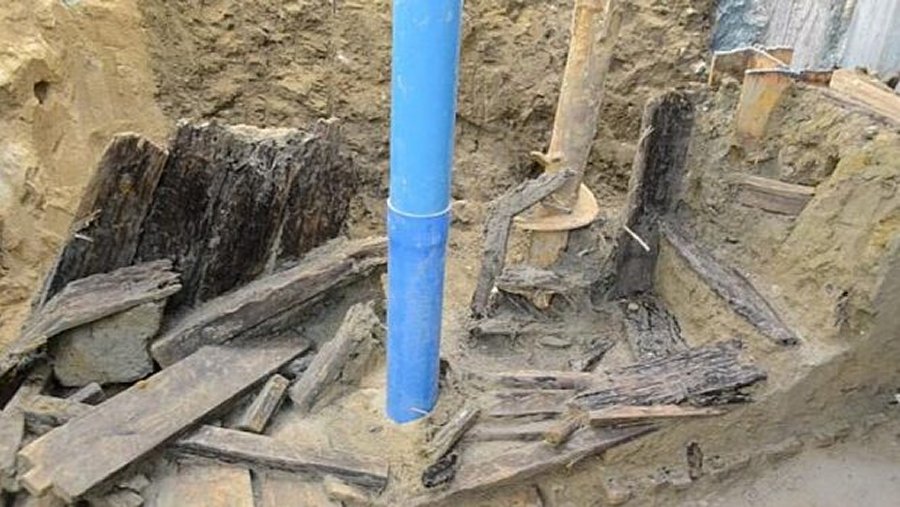 At first, a piece of wood was found, and shortly afterward other pieces of wood emerged from the yellow-brown soil layer more than six meters below East Railway Street. Eventually, the archaeologists laid out short planks, almost all of which lay neatly side by side, forming a floor-like surface, about one meter long, and some of the pieces of wood were broken.