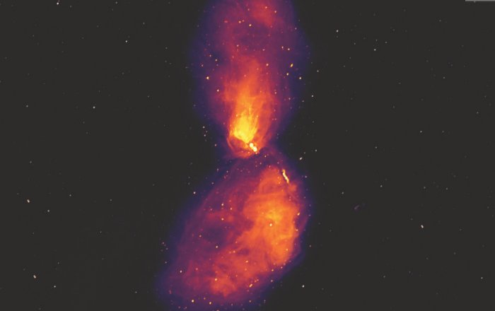 When viewed from Earth, the eruption from Centaurus A now extends eight degrees across the sky—the length of 16 full Moons laid side by side. It was captured using the Murchison Widefield Array (MWA) telescope in outback Western Australia.