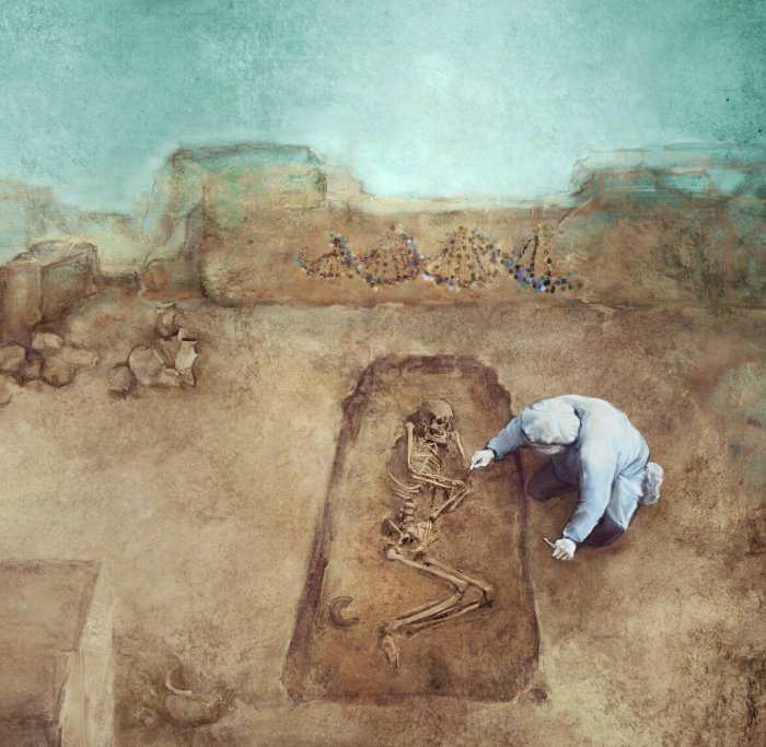 Drawing of a scientist working with human skeletal remains and ancient DNA. Credit: Marija Stojkovic