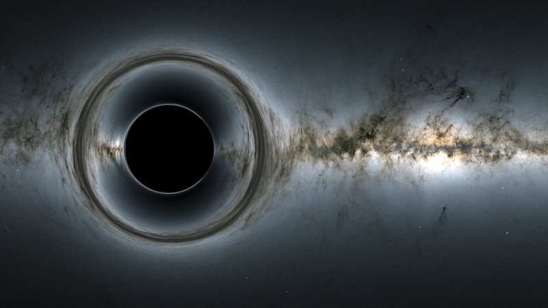 This simulation of a supermassive black hole shows how it distorts the starry background and captures light, producing black hole silhouettes. Credit: NASA’s Goddard Space Flight Center; background, ESA/Gaia/DPAC