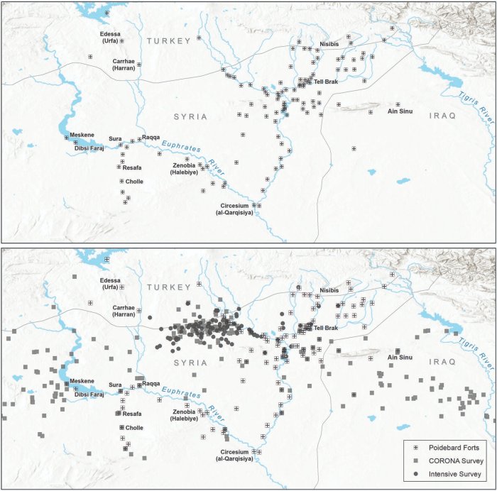 Map showing distribution of forts as discovered by Poidebard (above) and the authors (below). Credit: Antiquity (2023). DOI: 10.15184/aqy.2023.153