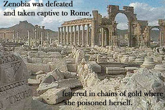 The Romans attacked Palmyra and laid siege to the fortified city of Palmyra. The queen Zenobia was defeated and taken captive to Rome, fettered in chains of gold where she poisoned herself.