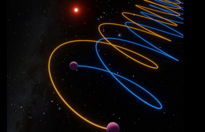This artwork highlights a pair of recently uncovered brown dwarf twins, named Gliese 229 Ba and Gliese 229 Bb. Gliese 229 B, discovered in 1995, was the first-ever confirmed brown dwarf, but until now astronomers thought they were observing a single body not two. New observations from the European Southern Observatory’s Very Large Telescope in Chile revealed that the orb is two brown dwarfs tightly orbiting around each other every 12 days (as indicated by the orange and blue orbital lines), with a separation only 16 times larger than the distance between Earth and the Moon. The brown dwarf pair orbit a cool M-dwarf star every 250 years. Credit: K. Miller, R. Hurt (Caltech/IPAC)
