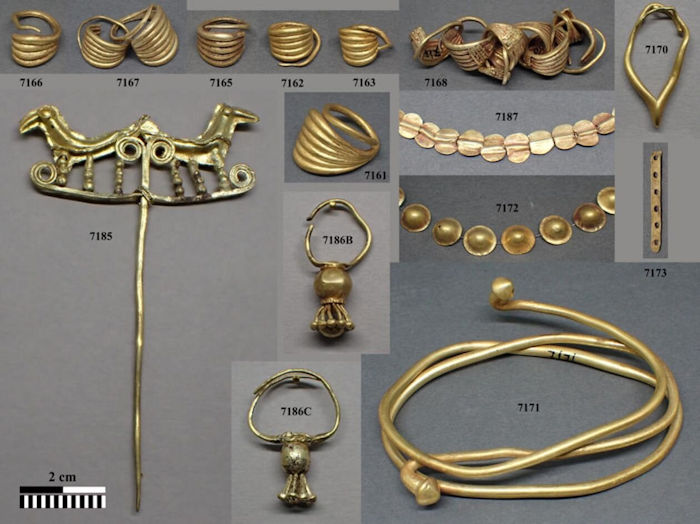 Hair ornaments (top left), a pin (bottom left), necklaces (center) and a torque (bottom right) were among the total 26 gold objects from Poliochni on Lemnos that have been studied by the international team of researchers. Credit: Christoph Schwall / Austrian Archaeological Institute (ÖAI) Vienna