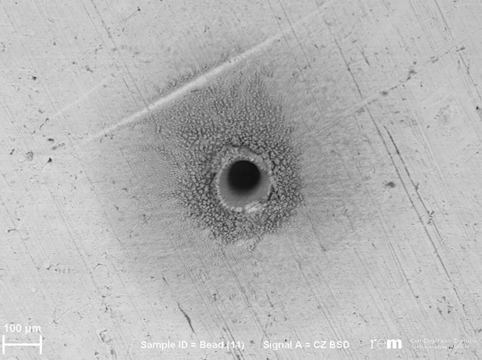 The hole melted in the surface of the gold item with the beam from the portable laser ablation system measures just 120 micro-meters in diameter and is conical in form. The damage to the gold object can only be discerned using an electron microscope. Credit: Universitaet Tübingen