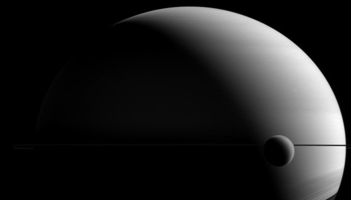 Saturn’s moon Titan is shown in the foreground, with Saturn looming behind it. This image was captured by the Cassini spacecraft on May 22, 2015. image credit: NASA