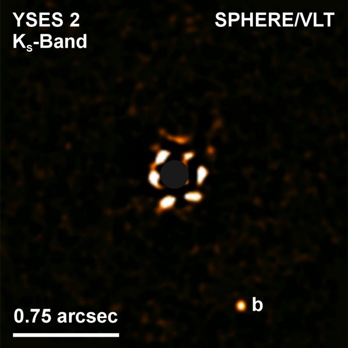 A direct image of the exoplanet YSES 2b (bottom right) and its star (centre). The star is blocked by a so-called coronagraph. Credit: ESO/SPHERE/VLT/Bohn et al.