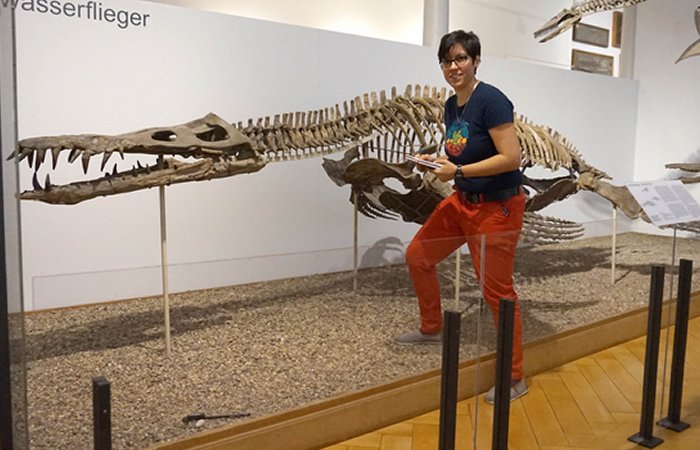 Palaeobiologist Dr Susana Gutarra taking measurements from a very complete specimen of Liopleurodon, a plesiosaur from the Middle-Late Jurassic of Germany (Museum of Palaeontology in Tübingen). Credit: Dr Susana Gutarra