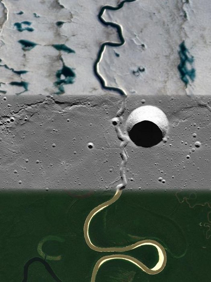 Sinuous channels.Satellite images show a sinuous ice channel in North East Land, Greenland; volcanic sinuous rille Rima Seuss on the Moon; and the meandering Juruá River in Brazil. Image credit: Compilation by Tim Goudge / Jackson School